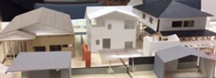 西側から見た構想モデル(左からカフェ、保育棟、母屋)